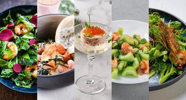 В данной подборке представлены оригинальные и вкусные салаты с креветками от талантливых московских шефов — от простого, но всем известного «Бора-Бора» из «Кофемании», до более сложных рецептов, требующих тщательного выбора ингредиентов. В арсенале заправок — трюфельная паста, майонез васаби, морковная заправка и даже масло с куркумой. В сочетании с креветками в салатах можно смело добавлять всё, от брокколи до авокадо и киноа, ведь их присутствие никогда не будет избыточным.