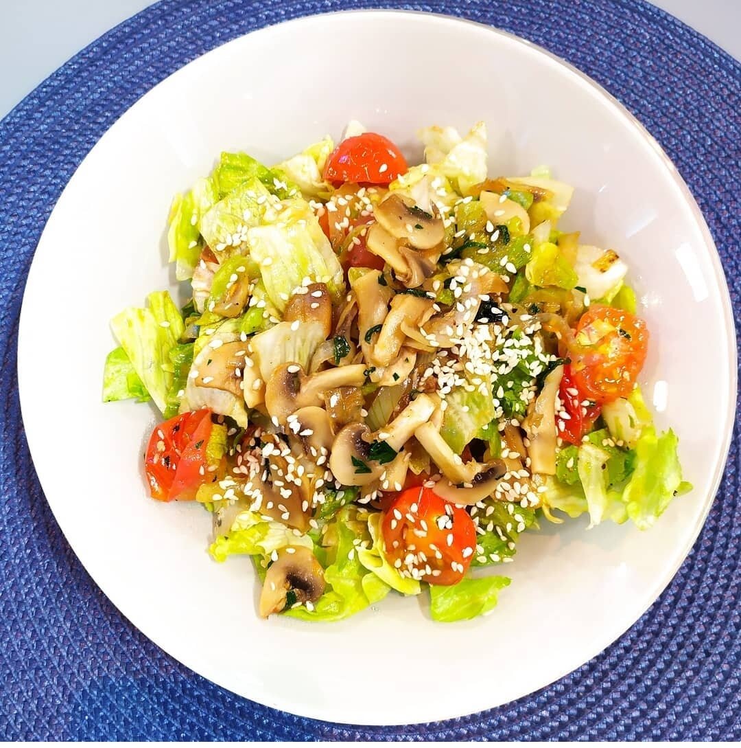4. Пока постные ингредиенты жарятся, нарезать салат айсберг и заправить его оливковым маслом. Выложить в салатник и сверху аккуратно разместить обжаренные грибы с овощами и зеленью.