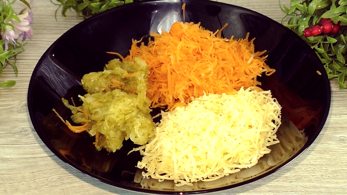 Для начала натрите на мелкой тёрке сыр и морковь. Это можно сделать с помощью кухонного комбайна или стандартной терки — важен только конечный результат!