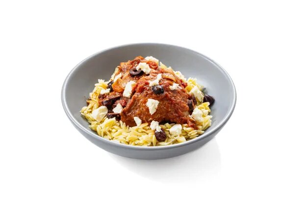 Подготовьте все ингредиенты. Куриные бедра тщательно посолите и поперчите.На сковороде разогрейте смесь оливкового и растительного масла на среднем огне. Обжарьте курицу с кожей до золотистой корочки, по 4 минуты с каждой стороны.После обжаривания переложите курицу на тарелку, полив ее 2 ст. ложками вытопленного жира с сковороды.Нарежьте крупными кусками репчатый лук и чеснок. Оливки нарежьте кольцами.В той же сковороде обжарьте лук в течение 3 минут, затем добавьте чеснок и продолжайте готовить еще минуту до появления аромата.Добавьте к луку консервированные помидоры, оливки, красное вино и орегано. Верните курицу обратно в сковороду.Доведите соус до кипения, затем убавьте огонь, накройте крышкой и тушите около 25 минут.На финальном этапе разложите куриные бедра по тарелкам, полейте ароматным соусом и посыпьте измельченной фетой. Паста орзо станет идеальным гарниром к блюду.Это блюдо украсит ваш стол и удивит гостей. Приятного аппетита!