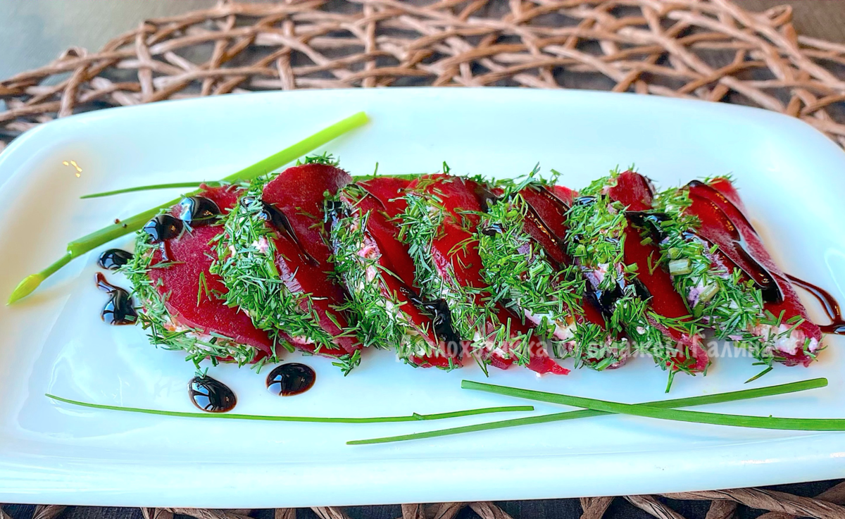 Изюминка этого блюда — свежая зелень. Укроп мелко нарезать и обвалять свекольную закуску, но можно использовать и другую зелень, например, базилик или кинзу, в зависимости от ваших предпочтений.