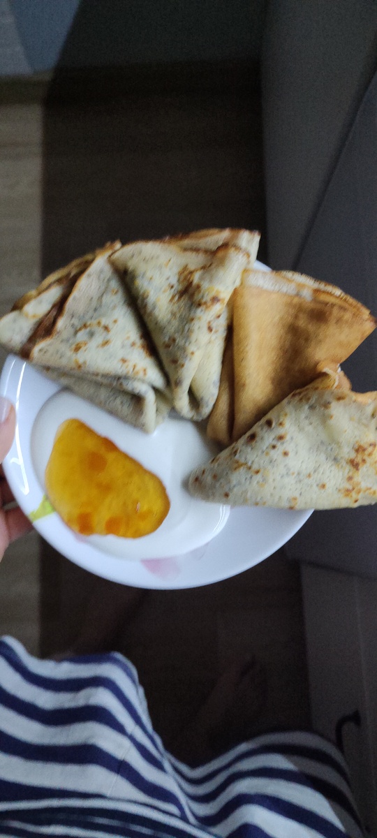 Утро начинается с аппетитных блинов, поданных со сметаной и джемом. Такое сочетание не только порадует вкус, но и зарядит энергией на первый половину дня.