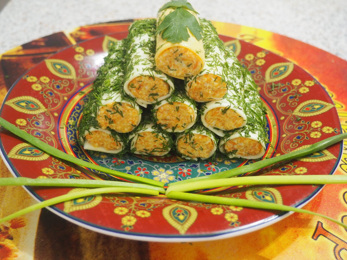 После этого укроп мелко нарезается. На подготовленную зелень помещаются пластинки сыра. Затем на сыр выкладывается начинка из моркови и яиц.