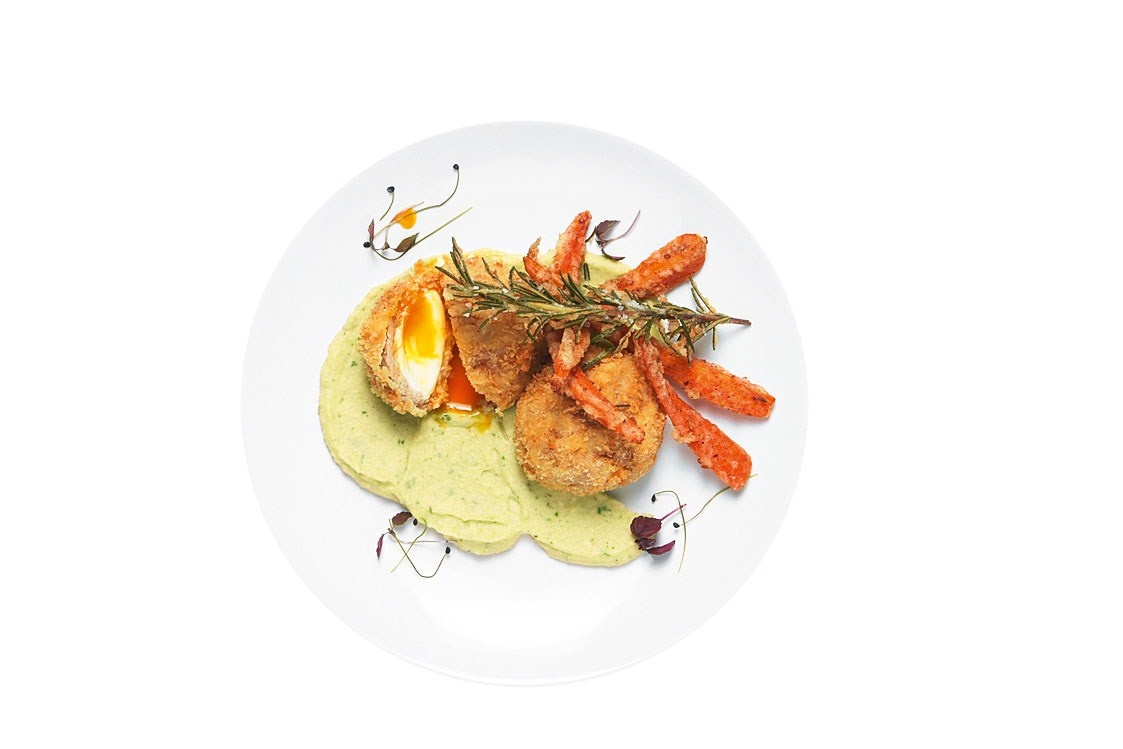 В кипящую воду аккуратно опустить восемь яиц. Довести до кипения, затем уменьшить огонь и варить 4 минуты. После этого вынуть яйца и сразу поместить в ледяную воду на 15 минут.Осторожно очистить яйца от скорлупы, начиная с тупого конца, чтобы избежать повреждений.В блендере смешать мясной фарш с тертым сыром до однородного состояния. Затем переложить массу в стационарный миксер, добавить тимьян, горчицу, приготовленный лук, молоко, специи и замесить до получения липкой консистенции.Из полученного теста сформировать 8 шариков, распластать их на пленке и поместить в центр отваренное яйцо. Завернуть бомбочку и оставить в холодильнике на 30 минут.Приготовить кляр, смешав муку, воду, соль и кубик льда. Охладить 30 минут, затем перед жаркой добавить еще один кубик льда.Обвалять бомбочки в муке, затем в яйце и хлебных крошках. Обжарить в разогретом масле до золотистой корочки.Подавать с жареными овощами или пюре из сельдерея, добавляя по желанию цукини.