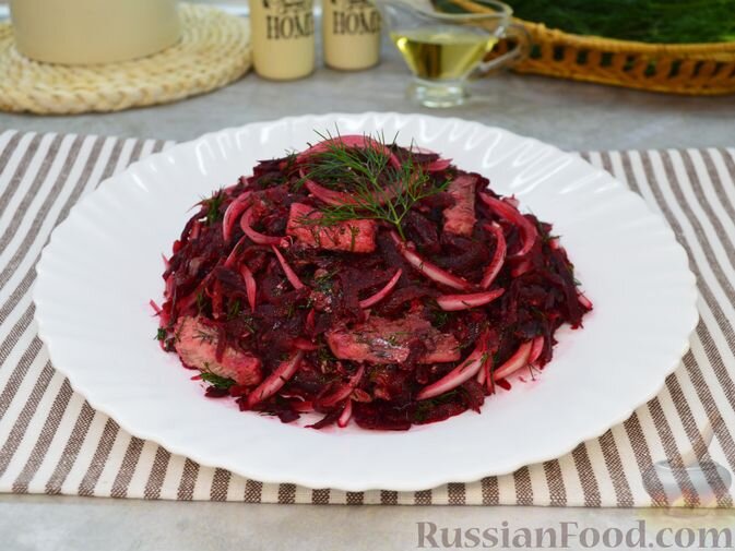 - Салат из свёклы с рыбными консервами. Этот салат – настоящий находка для любителей простоты и экстравагантного вкуса. Свежая свёкла в сочетании с консервами, репчатым луком и ароматным укропом создает интересный вкусовой букет.