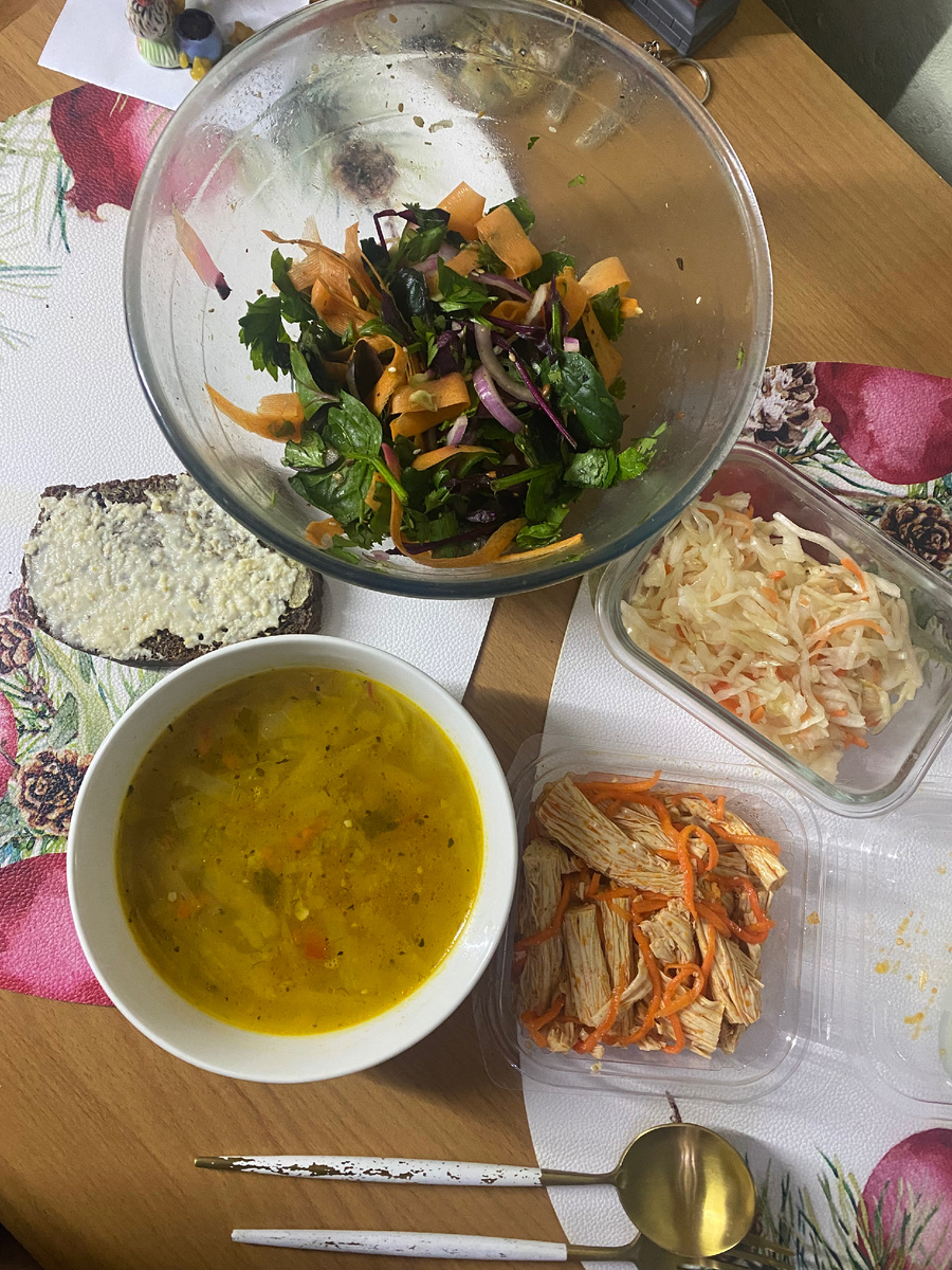 - Ужин: Нежный овощной суп, остаток которого завершает день, а также ломтик ржаного хлеба с горчицей и хреном, который добавляет остроты. Спаржа и немного квашеной капусты с кунжутным маслом дополняют трапезу, а хурма завершает ужин на сладкой ноте.
