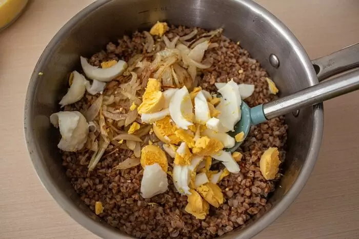 5. Когда гречка будет готова и впитает всю жидкость, необходимо перемешать её с обжаренными грибами и луком, добавить соль, перец и приправы, а также сливочное масло по вкусу.
