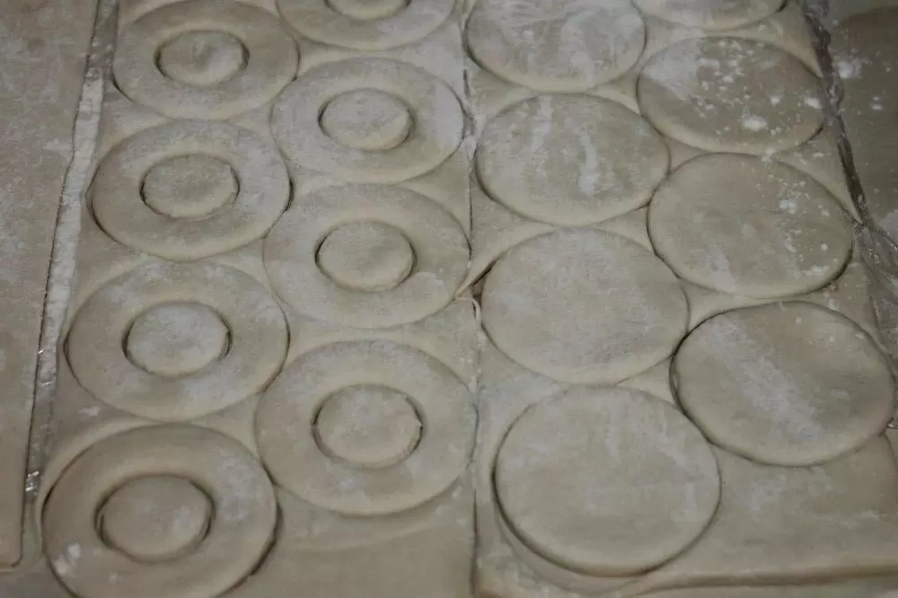 Теперь пришла пора заняться тестом. Его раскатывают до толщины примерно полсантиметра. Из теста вырезаются кружки диаметром 5-6 см с помощью стакана. Из половины этих кружков вырезаются колечки шириной около 1 см.