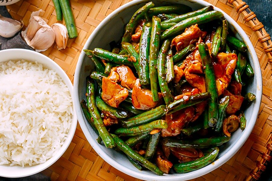 Нарежьте куриное мясо небольшими кусочками, толщиной около 5 мм, поперек волокон.В миске смешайте ингредиенты для маринада и добавьте кусочки курицы. Перемешайте рукой, чтобы мясо хорошо пропиталось, и оставьте мариноваться на 10-15 минут.В другой небольшой миске соедините все составляющие соуса и тщательно перемешайте до полного растворения сахара.Измельчите чеснок.На среднем огне разогрейте глубокую сковороду и добавьте 2 ст.л растительного масла. Выложите курицу в один слой. Обжаривайте до золотистого цвета по 1-2 минуты с каждой стороны. Уберите с огня, оставив слегка розоватое мясо внутри.В ту же сковороду влейте еще 2 ст.л масла и выкладывайте фасоль в один слой. Обжаривайте минуту, затем перемешайте и готовьте еще 30 секунд. Добавьте 2-3 ст.л воды, накройте крышкой и дайте пропариться минуту-полторы.Снимите крышку, добавьте чеснок и обжаривайте еще 30 секунд. Влейте шаосинское вино, затем добавьте подготовленный соус, не забыв его перемешать перед этим.Проведите соус до кипения, верните курицу в сковороду и тщательно перемешайте, чтобы каждый кусочек был покрыт соусом. Как только соус загустеет, снимите с огня. Блюдо готово!Приятного аппетита!