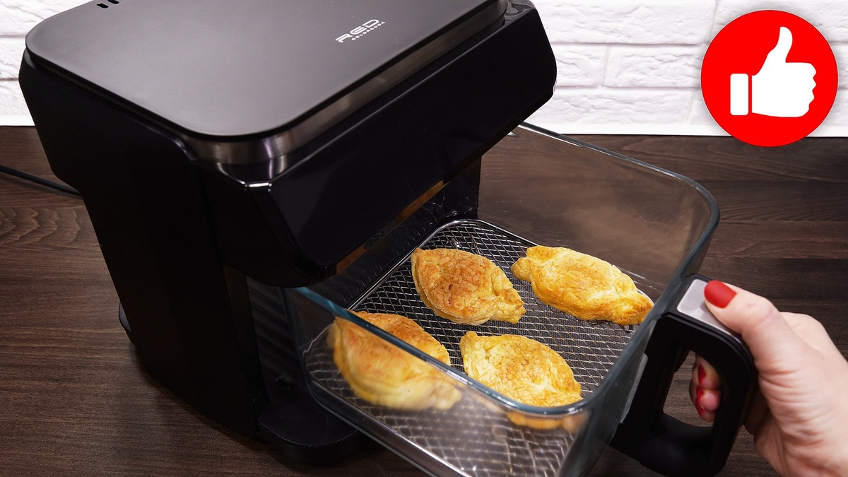 Разместить лодочки на нижней решетке аэрогриля, по 4 штуки. Установить режим «Мультиповар» на 170°C и готовить в течение 10 минут. После завершения кулинарного процесса дать закускам немного остыть, а затем с помощью ложки сделать небольшое углубление в центре каждой лодочки.