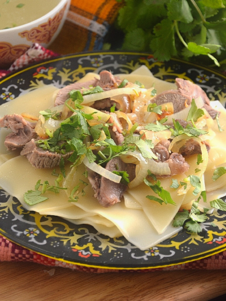 3. Завершение блюда: Как только мясо сварится, его следует извлечь, отделить от костей и нарезать тонкими кусками. Бульон не будет выброшен — его нужно будет процедить и довести до кипения, чтобы отварить лапшу. Готовую лапшу поместить на большое блюдо, сверху выложить нарезанное мясо, затем обжаренный лук и посыпать свежей рубленой зеленью. Подавая, не забудьте налить горячий бульон отдельно — его можно наслаждаться в чистом виде или добавлять в тарелку для усиления вкуса.