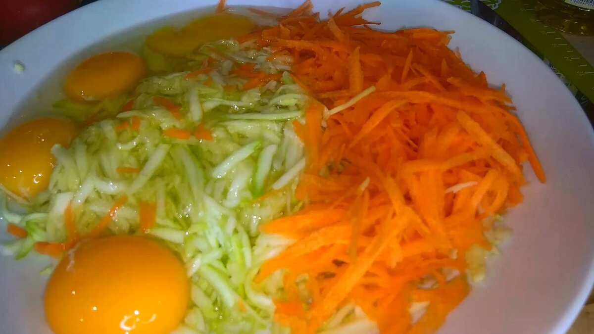 Для начала необходимо подготовить овощи. Кабачок очистить от кожицы и натереть на крупной терке. Морковь выполнить те же манипуляции. Смешать натертые овощи с яйцами, добавляя соль и перец по вкусу. Все тщательно перемешать до получения однородной массы.
