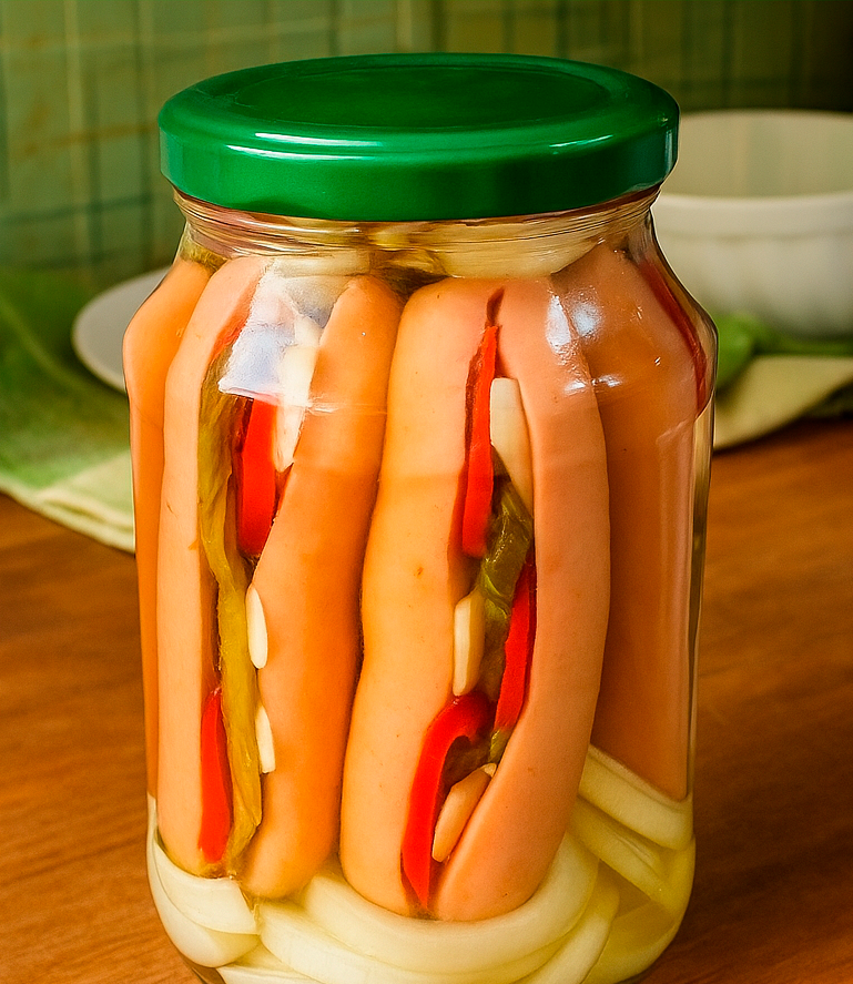 5. Заполнить банки нафаршированными сосисками, перемежая их с оставшимися овощами. Залить теплым маринадом, чтобы он полностью покрыл содержимое. Закрыть крышками и оставить до полного остывания.