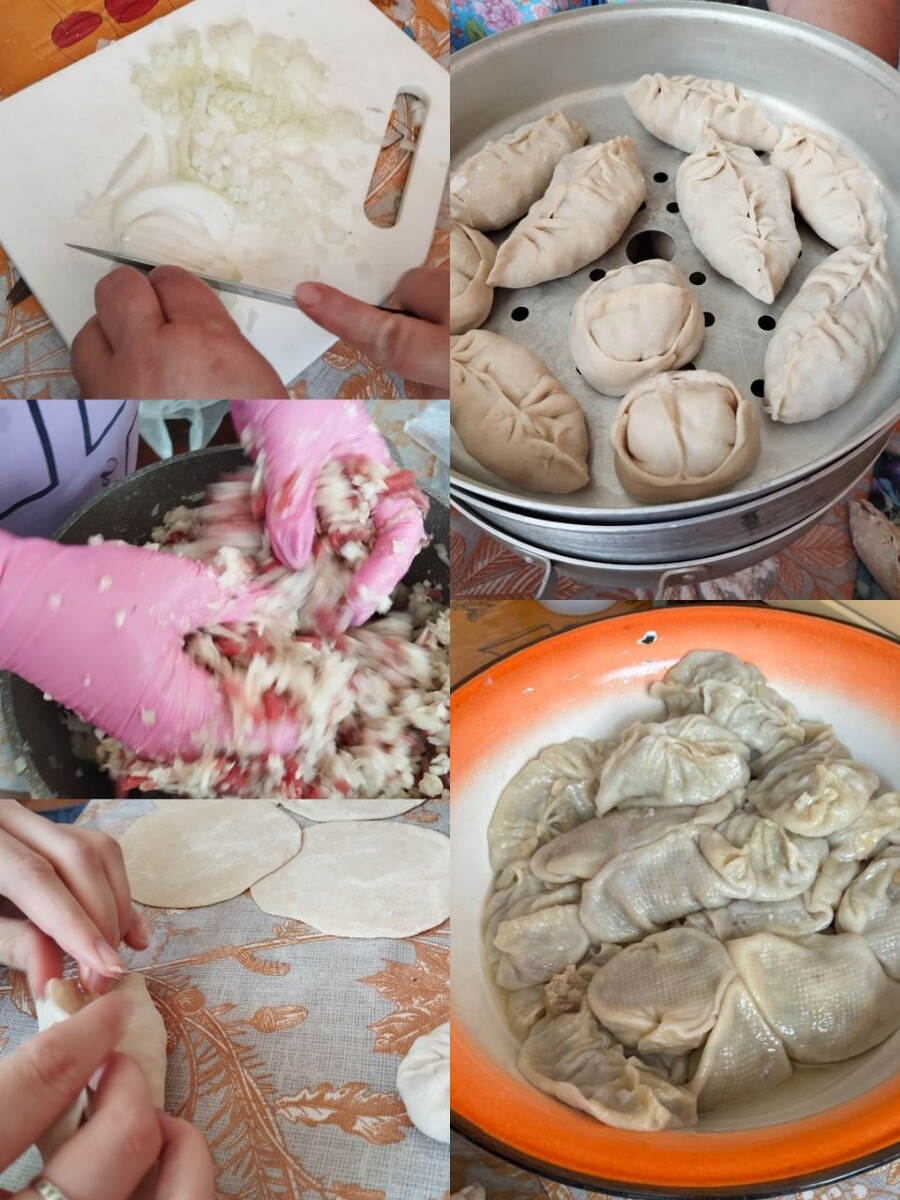 - Затем, каждый из помощников вносит свою лепту: кто-то мелко нарезает лук, кто-то формирует манты, а кто-то просто поддерживает разговор.