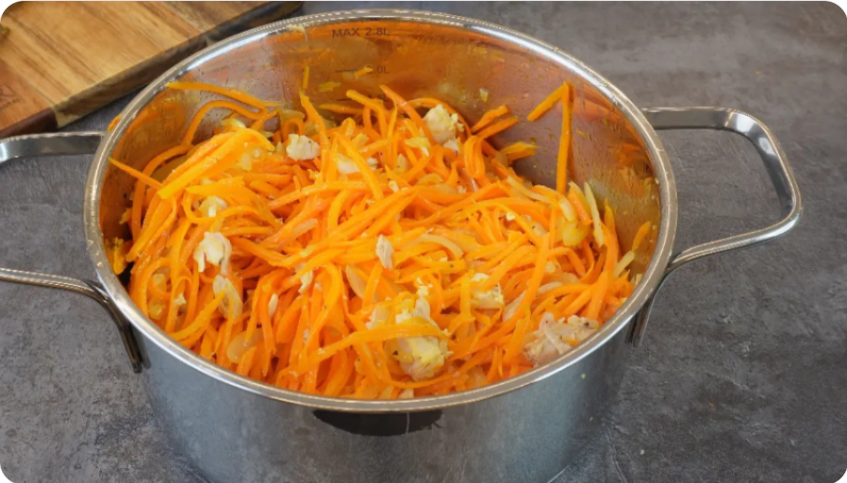 Пока курица готовится, можно подготовить остальные ингредиенты. Морковь (600 г) натирается на терке, предпочтительно для корейской моркови, чтобы получить длинные полоски. Репчатый лук (200 г) нарезается четвертинками колец и обжаривается в разогретом масле до полупрозрачного состояния.