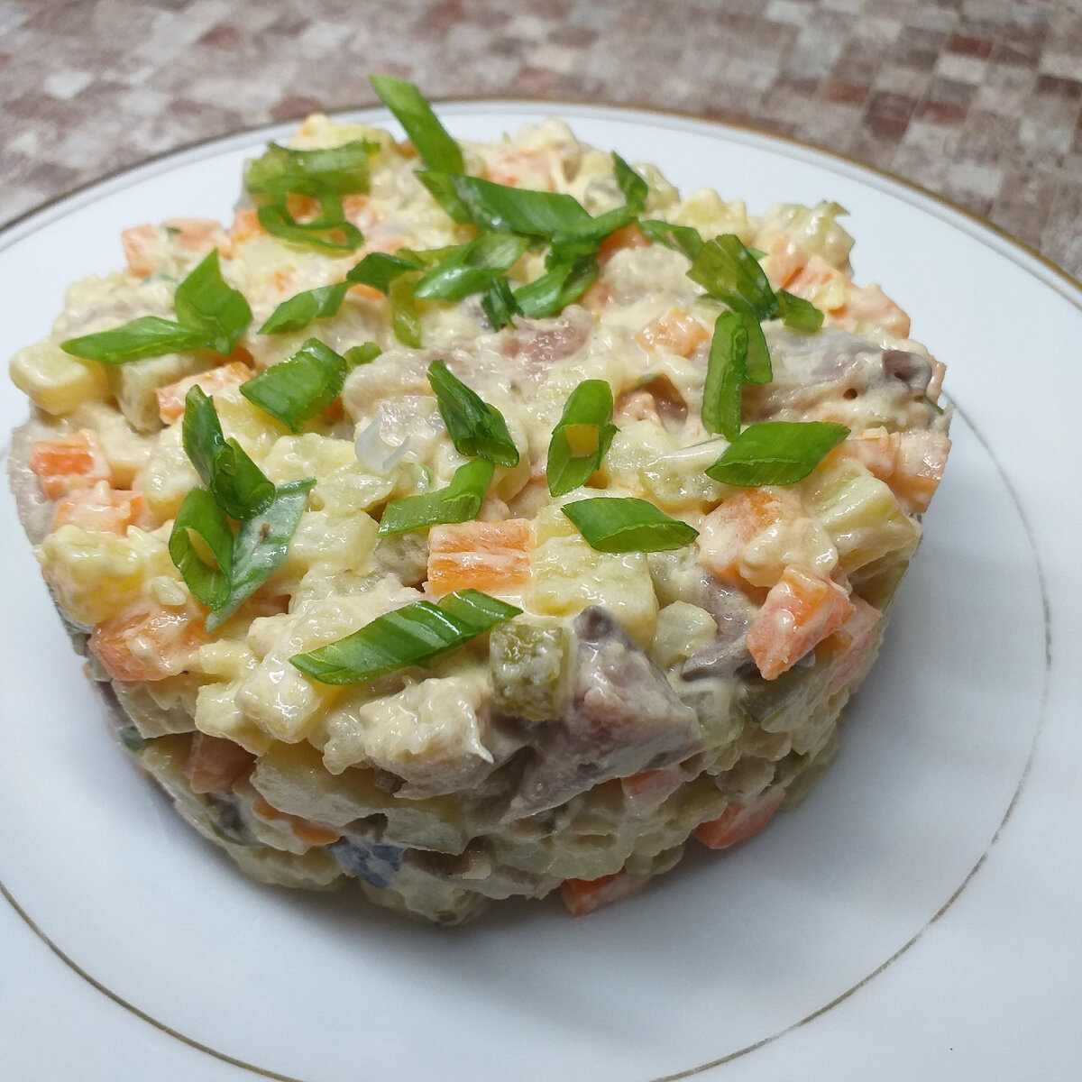 Это блюдо, насыщенное вкусом и цветом, станет настоящей изюминкой любого угощения. В его состав входят отварные картофель и морковь, солёные огурцы, свежий зелёный лук и ароматная копчёная скумбрия. Заправка, состоящая из майонеза и соевого соуса, добавляет блюду уникальный вкус и изысканный аромат.