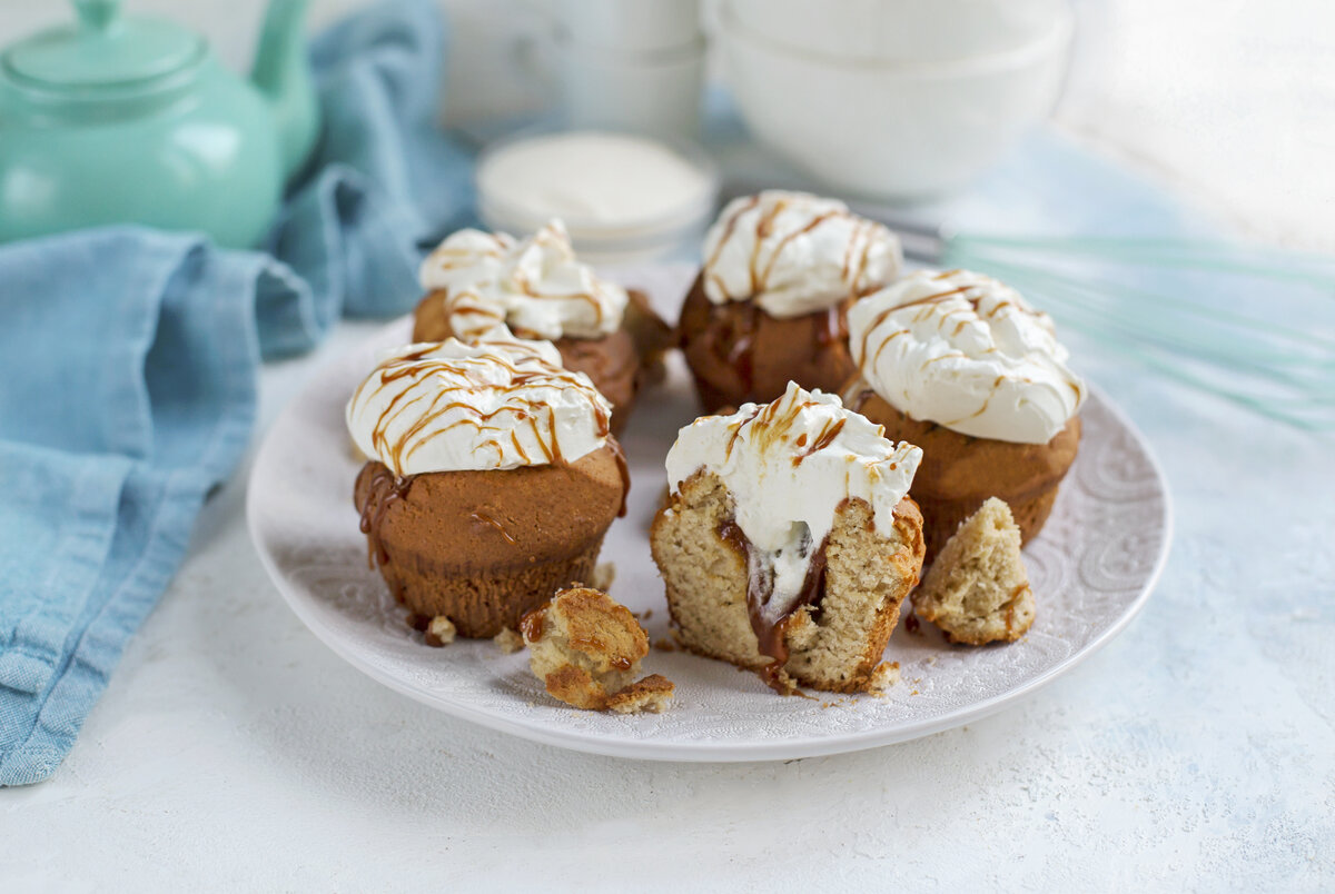 Взбейте оставшиеся сливки до пышности и аккуратно распределите по каждому капкейку. Полейте оставшейся карамелью и подавайте к столу.