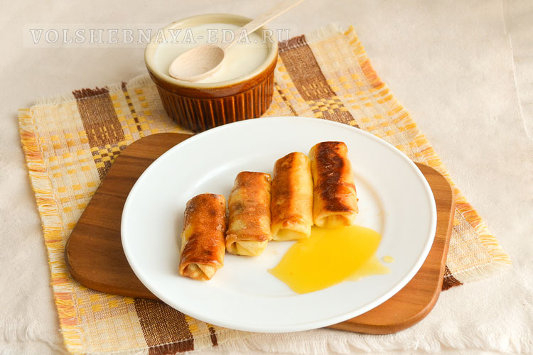 Формируйте налистники, нарезая каждый блин на четыре части. Столовую ложку начинки размещайте на широкую сторону блинчика, аккуратно заверните его, заправив края. Выложите налистники в смазанную маслом форму, сверху смажьте сливочным маслом и посыпьте сахаром для образования карамельной корочки.