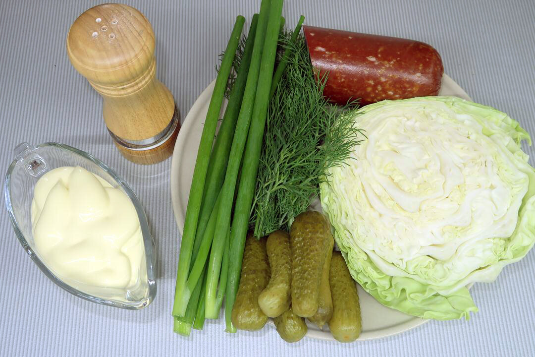 Теперь пора смешать все ингредиенты. В капусту добавляем колбасу, огурцы, зелень и майонез. Тщательно перемешиваем все компоненты, а перед подачей стоит дать салату настояться около 10 минут, чтобы все вкусы объединились.