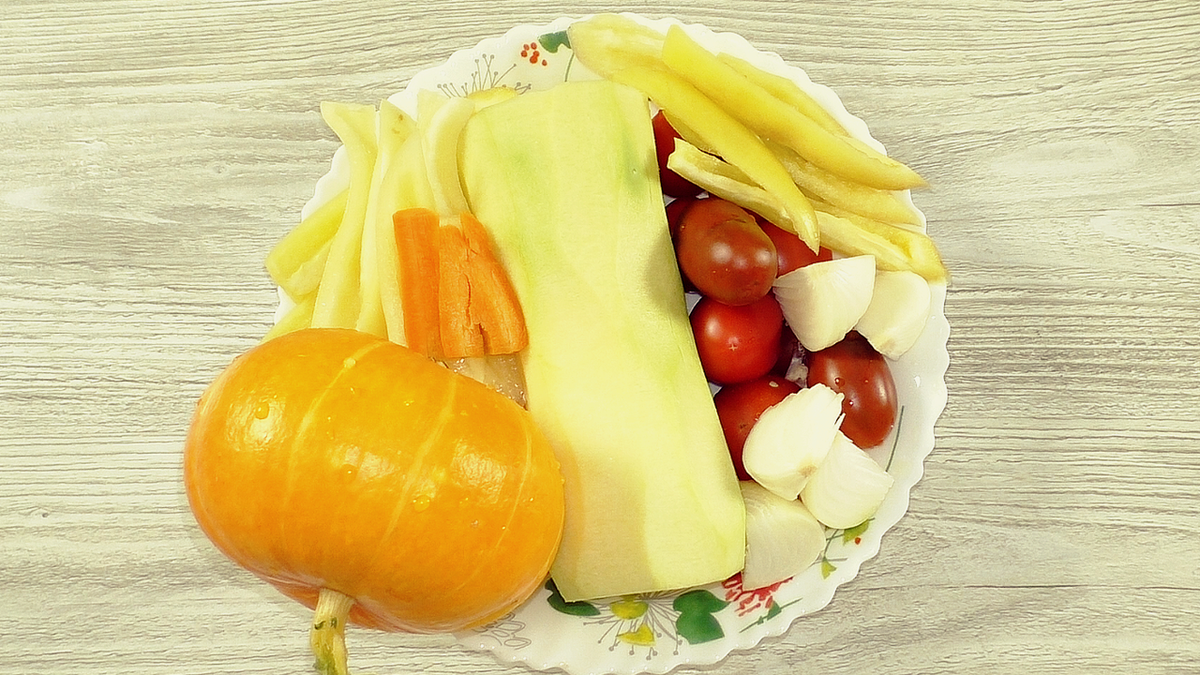 Подготовка включает в себя нарезку свежих овощей. Кабачок, болгарский перец и морковь нарезать довольно крупно, чтобы сохранить их текстуру. Помидоры можно нарезать на четвертинки, а более мелкие оставить целыми. Лук также нарезают крупно, а тыкву можно порезать произвольно. Все нарезанные овощи помещаются в форму для запекания, предварительно застеленную фольгой или пергаментом.