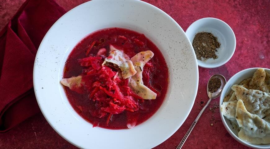 В этой особенной версии борща акцент сделан на грибах, а именно – на варениках с грибной начинкой, которые в народе называют «ушками».