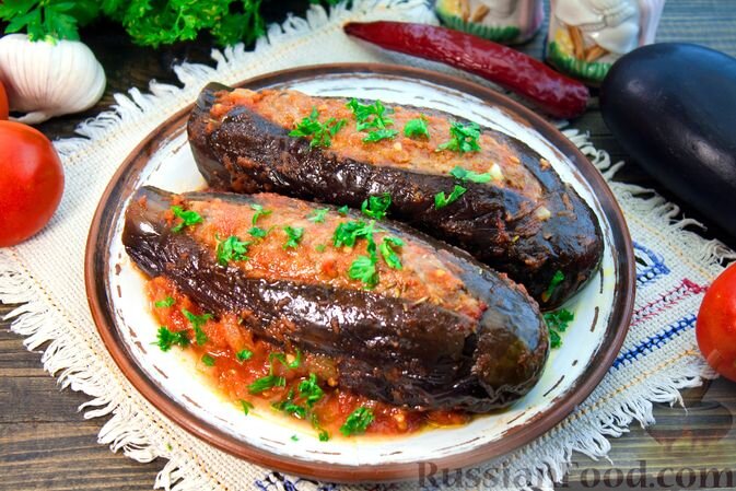 Фаршированные баклажаны с мясом — это изысканное блюдо, в котором баклажаны наполняются ароматным говяжьим фаршем, приправленным специями и укладываются в томатный соус. После запекания они становятся мягкими, насыщенными и невероятно вкусными.