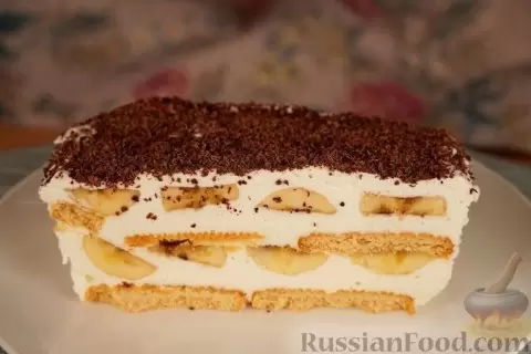 - Торт с печеньем и бананами: Этот десерт, приготовленный из сливок и сливочного сыра, легко украсит любой стол. Ломтики банана в сочетании с печеньем делают его невероятно нежным и полезным. Не забудьте дать торт застынуть в холодильнике на несколько часов!