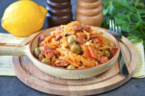 • Завершить приготовление, добавив оливки, сок лимона и стакан воды, затем накрыть крышкой и томить на среднем огне около 30-35 минут. Если капуста предпочитается мягче, следует увеличить время приготовления.