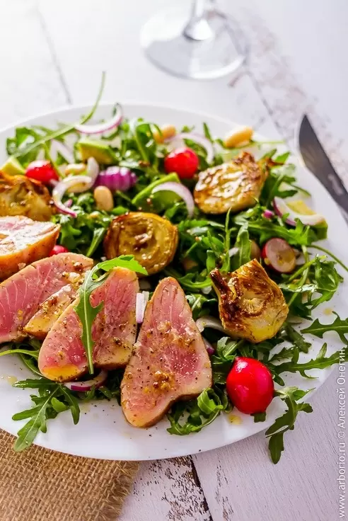 Чтобы приготовить салат, разморозьте филе тунца, поместив его в холодильник за сутки до готовки. Обжарьте его на гриле или на сковороде, затем дайте ему отдохнуть на бумажном полотенце, чтобы избавиться от лишнего масла. Артишоки также можно поджарить до золотистой корочки.