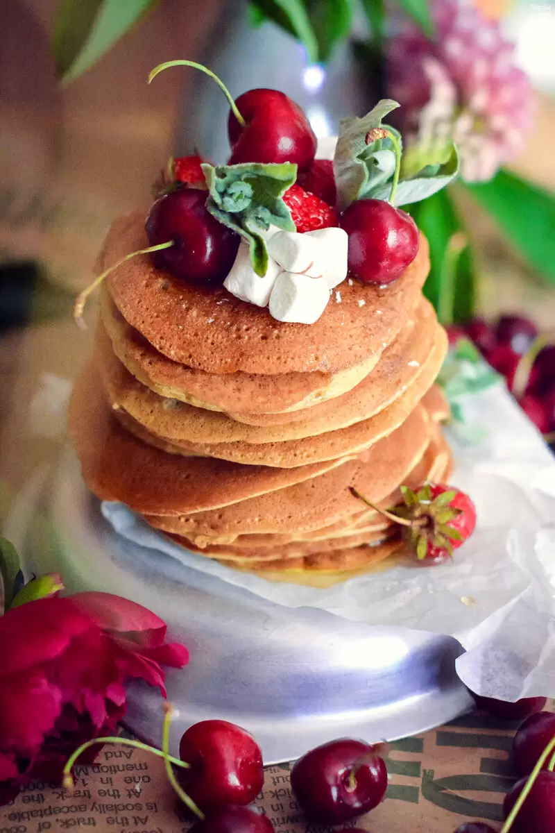 Эти панкейки можно подавать с ягодами, сгущённым молоком, мёдом или сметаной — выбирайте по своему вкусу!