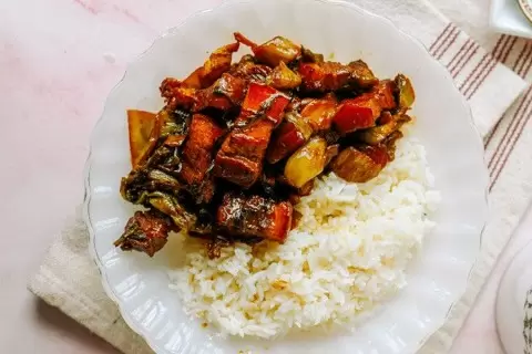 Квашеную горчицу нарезать: стебли на кусочки по 1.5 см, листья чуть крупнее. Имбирь также нарезать ломтиками.Бадьян, лавровые листья, палочку корицы и сычуаньский перец поместить в фильтр-пакет или завязать в марле.Подчеревок нарезать на кусочки толщиной 2 см и переложить в кастрюлю с водой. Довести до кипения, затем быстро слить воду и промыть мясо.На сковороде разогреть столовую ложку растительного масла и растопить сахар до янтарного цвета. Добавить свинину и слегка обжарить до румяности.Влить шаосинское вино, воду, добавить соевые соусы и специи. Довести до кипения, затем уменьшить огонь и тушить около 35 минут под крышкой.В отдельной сковороде разогреть оставшееся масло. Обжарить имбирь в течение 1 минуты, затем добавить квашеную горчицу и продолжать готовить, пока зелень не подсохнет, примерно 5-8 минут.По истечении времени с мясом, удалить пакет со специями и добавить обжаренную горчицу с имбирем. Готовить еще около 15 минут, чтобы мясо стало более нежным.Приятного аппетита!