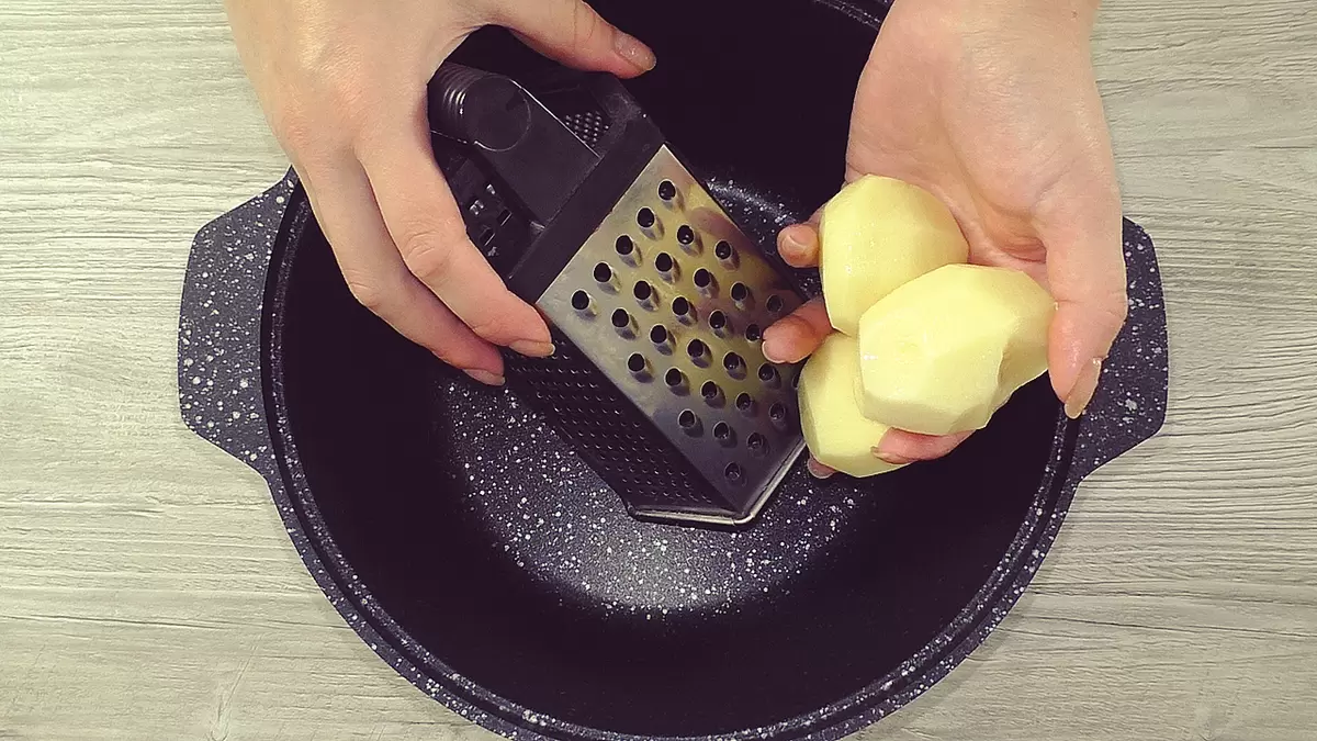Начало приготовления — это мелкая натерка очищенного картофеля. После этого добавьте немного соли, перемешайте и оставьте на 3 минуты. Это позволит жидкости стечь, и для дальнейшего процесса вам потребуется только плотная масса.