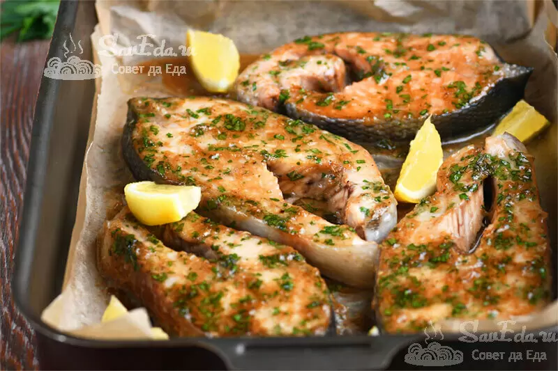 Форму для запекания необходимо смазать приготовленным чесночным соусом и разместить куски рыбы, тщательно полив их сверху соусом. Первые 5 минут рыба готовится при температуре 200 градусов, после чего важно аккуратно распределить соус по бокам. Затем рыбу оставляют в духовке еще на 10 минут, чтобы она пропиталась ароматами и вкусами.