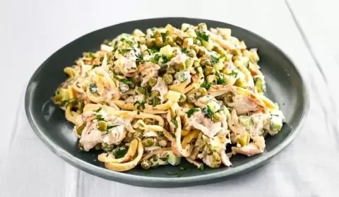 Куриное филе дополняют яйца, огурец и зелёный горошек, всё соединяет майонез с лёгкой солью и перцем. Подача с зеленью завершает образ.