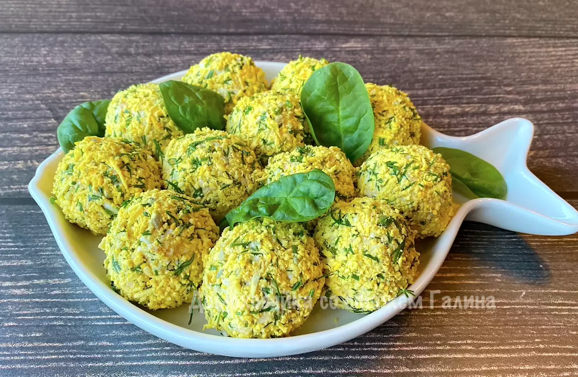 Для завершающего этапа приготовления шарики обваливаются в панировке из натертых желтков и мелко нарезанного укропа. После этого их выкладывают на красивое сервировочное блюдо, что создаст эффектный вид и привлечет внимание гостей.