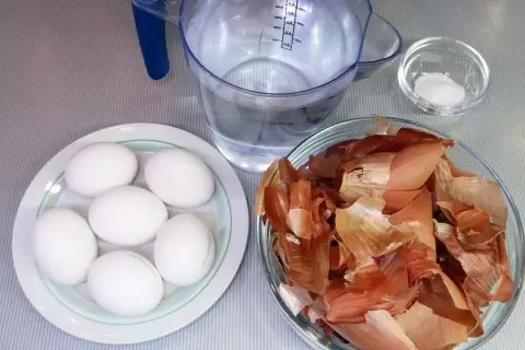 Первым шагом является подготовка отвара. Луковую шелуху необходимо промыть под струей воды, а затем поместить в кастрюлю. Для более насыщенного цвета рекомендуется использовать много шелухи, после чего залить все это холодной водой (1 литр).